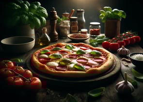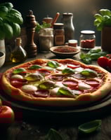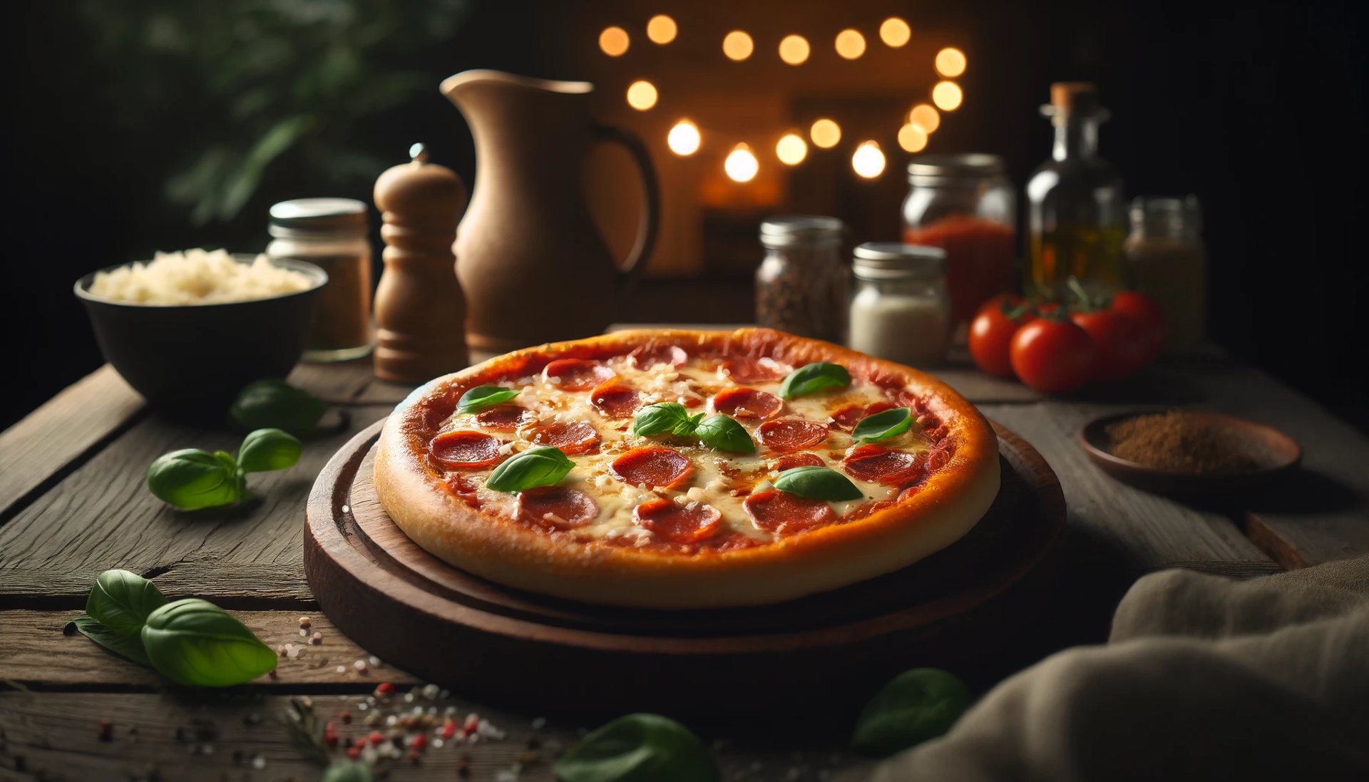 Classic pizza topped with tomato sauce, mozzarella cheese, and fresh basil leaves.